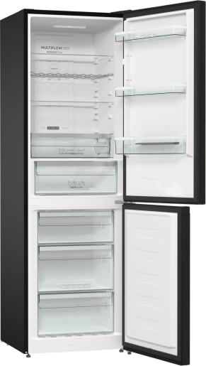 Samostojeći kombinovani frižider u elegantnoj crnoj boji sa zamrzivačem na dnu i ukupnom zapreminom 300 l (204 l frižider / 96 l zamrzivač) pruža optimalan prostor za četveročlano domaćinstvo. Energetske klase E, sa LED displejem i elektronskim upravljanjem na vratima, omogućava preciznu kontrolu temperature uz alarm za otvorena vrata i signalizaciju previsoke temperature. NoFrost Plus tehnologija, IonAir sa Multiflow 360° cirkulacijom zraka i AdaptTech pametni sistem osiguravaju ravnomjerno hlađenje bez leda, dok CrispZone ladica s regulacijom vlažnosti i funkcija brzog zamrzavanja čuvaju svježinu namirnica duže.